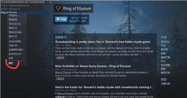 1.打开steam,单击“ring of elysium”后右击鼠标,点击属性