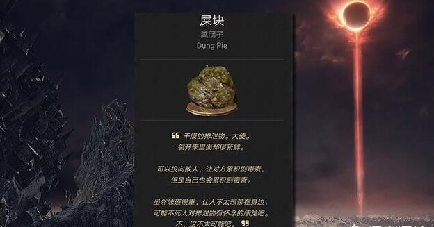 黑魂系列里有一个奇葩的道具叫做屎块。它的作用除了用来恶心一下玩家,就是用于投掷,让敌人中毒身亡。因为使用者自己也会中毒,这招在PVE中用处不大。但在无所不用其极的PVP中,有时候会有奇效,就看谁的屎块更熏人。
