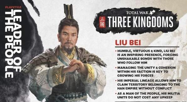 刘备是汉室后裔,为人谦逊仁德,不少人都誓死追随他。今日,《三国:全面战争》公布了刘备的人物设定详情,除了为国外玩家们科普了一下他的历史背景之外,还带来了他在游戏中的一些玩法介绍,一起来看看吧。