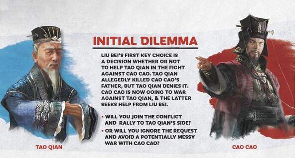 所有的诸侯在战役一开始都会面临一个最初的选择,而从官方给出的地图中我们可以看到,战役一开始刘备位于徐州地区,处于曹操的势力范围之内,因此他面临的第一个选择,就是要不要帮助陶谦对抗曹操,玩家们可以选择应邀协助陶谦,也可以选择无视请求,避免与曹操交战,保全自身。