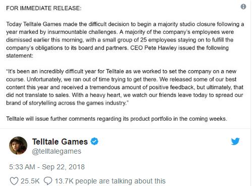 这篇博客的标题为”馿lltale closure”,妓秂lltale关闭,其中提到了最近这几年中,Telltale工作室就面临着大幅裁员,从2017年就解雇了四分之一的人员,而目前留下的25人也仅仅是主要骨干人员,以致于有关闭的趋势。他在博客的最后也表达了悲伤,因为Telltale正在面临着巨大的经济危机而即将走向破产。虽然每个人都想努力挽回这个局面,但是一切正在往变得更糟的方向发展。