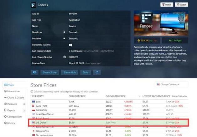 Fences官网的价格是全球价格,没错9.99美元,但是因为Steam对与售价是分区的。其实Steam上美国购买Fences的售价同样是9.99美元,这个可以从SteamDB上看出来。同时我们也可以看到,欧洲的售价更加夸张甚至到了12美元。