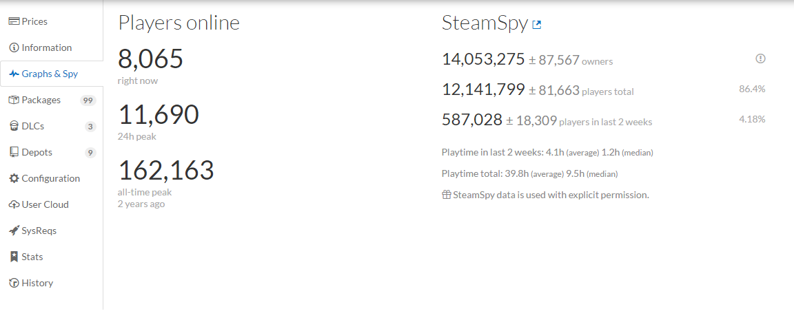 £¨SteamDB£©ºÍ£¨SteamSpy£©ÊÇÁ½¸östeamÊý¾Ý¿âÍøÕ¾£¬Ä㼸ºõ¿ÉÒÔÔÚÉÏÃæ²éµ½ËùÓÐÄãÏëÒªµÄ¶«Î÷£¬ÖîÈçÒ»¸öÓÎÏ·ÏÖÔÚÓжàÉÙÈËÔÚÍæ£¬ÓÐûÓйí·þ£»Õâ¸öÓÎÏ·Ê·µÍÊǶàÉÙ£¬Êʲ»ÊʺÏÈëÊÖ£»Ò»¸öÓÎÏ·ÏúÁ¿ÊǶàÉٵȵȡ£