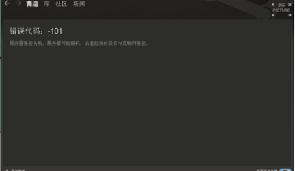 “Steam商店白屏、黑屏、进不去,排版出现错误,图片不显示,等等”,显示错误代码:-101,服务器连接失败,服务器可能脱机,或者您当前没有与互联网连接。