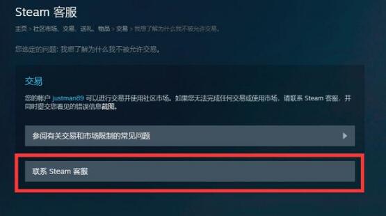 比如交易领域,点击无法交易,然后就会有联系Steam客服的选项。点击联系客服,进入人工申诉阶段。