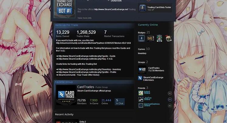 下面具体说下背景获得方式:市场里可以直接购买背景,或者通过升级徽章来获得背景。部分游戏支持集换式卡牌,只要玩一定时间就能收集其中一部分,再通过与好友交换卡牌或者去市场买,收集一整套后可以合成为徽章。收集成功会给你一些经验,一个属于那个游戏的背景和表情,还有一张游戏的优惠卷(几乎都是喜加一小游戏,我从来没买过)。所有背景与别的东西一样,分普通、罕见和稀有,都是合成时概率获得。徽章最高升五级,除此之外还有概率获得闪卡,闪卡徽章只有一级。