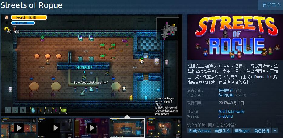 官方对这款游戏的评价是这样的:《废土之王》+《杀出重围》+《侠盗猎车手》,最重要的是结合Roguelike风格。给到你这三个游戏之后,你很快能想象到这是一款什么样的游戏,对这种超强结合体没有抵抗力~如果你喜欢像素、喜欢GTA开放世界玩法、喜欢Roguelike,那么Streets of rogue你应该试一试,游戏内也不仅仅可以探索开荒,还可以经营自己的小事业。总而言之,这是一款像素2D版的GTA。