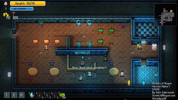 他不仅仅可以满足你单人任务、屠戮的欲望,你还可以与小伙伴三三两两联机任务,对抗。Streets of rogue给人的感觉就是:小而精。小在这么一款Roguelike可以让自己得到无限放松;精在游戏不大却样样俱全。