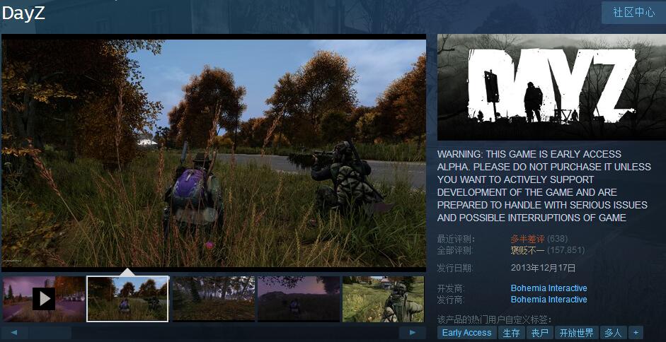 这个游戏真的独树一帜,13年出的现在都快五年了啊,还杂甽pha测试中。。波希米亚工作室也不知道在想点啥。而且你能在这款游戏中找到大火的吃鸡游戏的影子,末日丧尸的世界里,饥饿、口渴、疾病最最基本的生存是底线,可怕的不仅仅是丧尸,还有那些跟你抢夺生存资源的人类。然后就产生了。。要不就在末日世界下孤独活不下去自裁,要不就被别人给劫杀了。