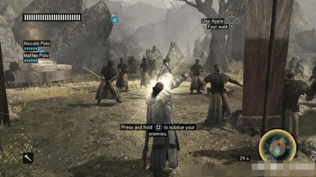 而在《刺客信条:启示录》当中,阿泰尔在回忆过去时用到的那颗金苹果就更加强悍,因为《兄弟会》当中艾吉奥使用的那颗金苹果的限制范围很小,而且蓄能太久需要留意自身的生命值,而阿泰尔使用的伊甸苹果能够直接召唤实体的分身,这些分身能够直接通过跳跃刺杀的方式直接从半空当中出现然后直接秒杀敌人,而且范围很广,简直是比作弊工具还要强大,年纪近九十岁的阿泰尔能够突围刺客送马可波罗下山,就是依靠伊甸苹果作弊一样的威力。