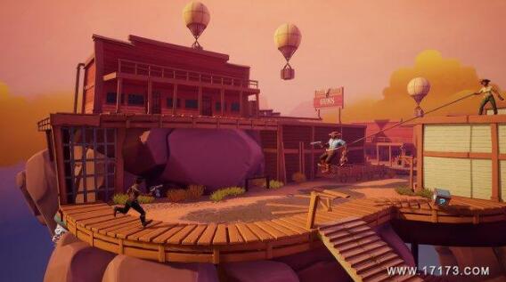 评测:典型的美国西部牛仔风范却又带点卡通的味道,类似《任天堂明星大乱斗》的玩法,这些有点奇怪的组合搭配起来确实有点意思。