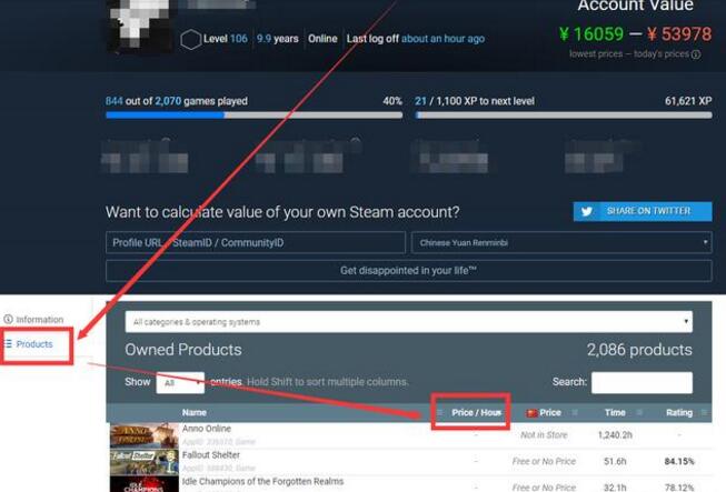 进人鎡eamDB,然后在Calculator上查询自己瞪鯠,然后找到下方的Products页面,对Price/Hour进行排序。需要说明的是,货币尽量选择US Dollar,因为某些游戏国服下架,会导致使用Yuan的时候不会有正常的价格出来(比如使命召唤系列、原型体系列)。然后初步排除掉免费游戏,或者付费游戏但是买来从没有玩过的(比如说我这边如龙0买来从没打开过,那游戏时间就是0)。然后使用爬虫或者是直接复制,,弄到个人数据库或者EXCEL里,进行初步的数据分析。xunji190101