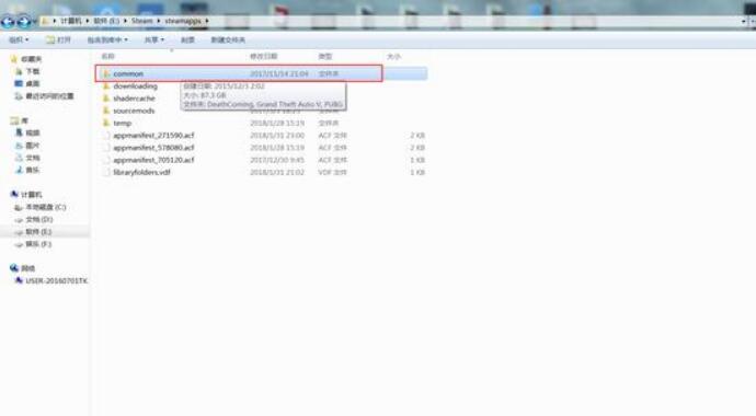 首先打开你的steam文件夹,找到其中叫做“steamapps”的文件夹,然后找到这个叫做√眔mmon”的文件夹。不过如果你是什么游戏都没下载过的话,那就不会有这个文件夹,可以连文件夹一起拷贝过来。steam所有的游戏默认都是下载在这个common文件夹里的,所以以后有类似的情况都可以到这个文件夹来寻找游戏。
