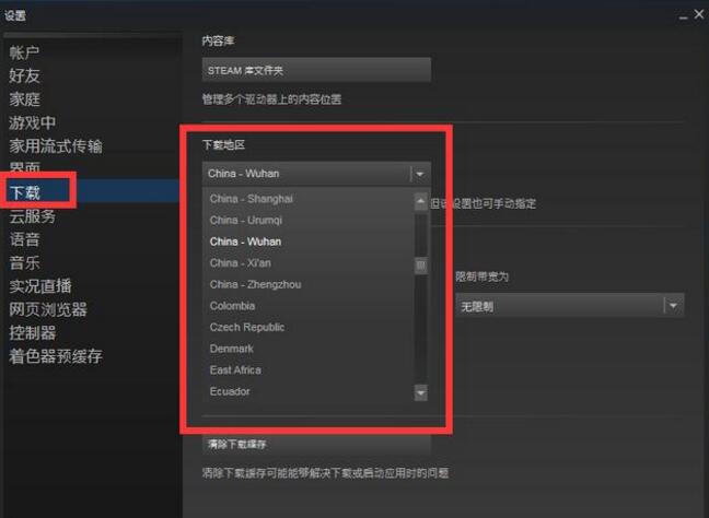 可以看到下拉有很多个下载节点可供选择,考虑到近期国内老牌节点负载普遍较高,大家可以尝试切换到国内新开的一些节点,比如说郑州的,乌鲁木齐的,西安的,长沙的,青岛的,昆明的都可以试一下,尽量选择离自己地理位置相对近的新节点。切换以后需要重启Steam。